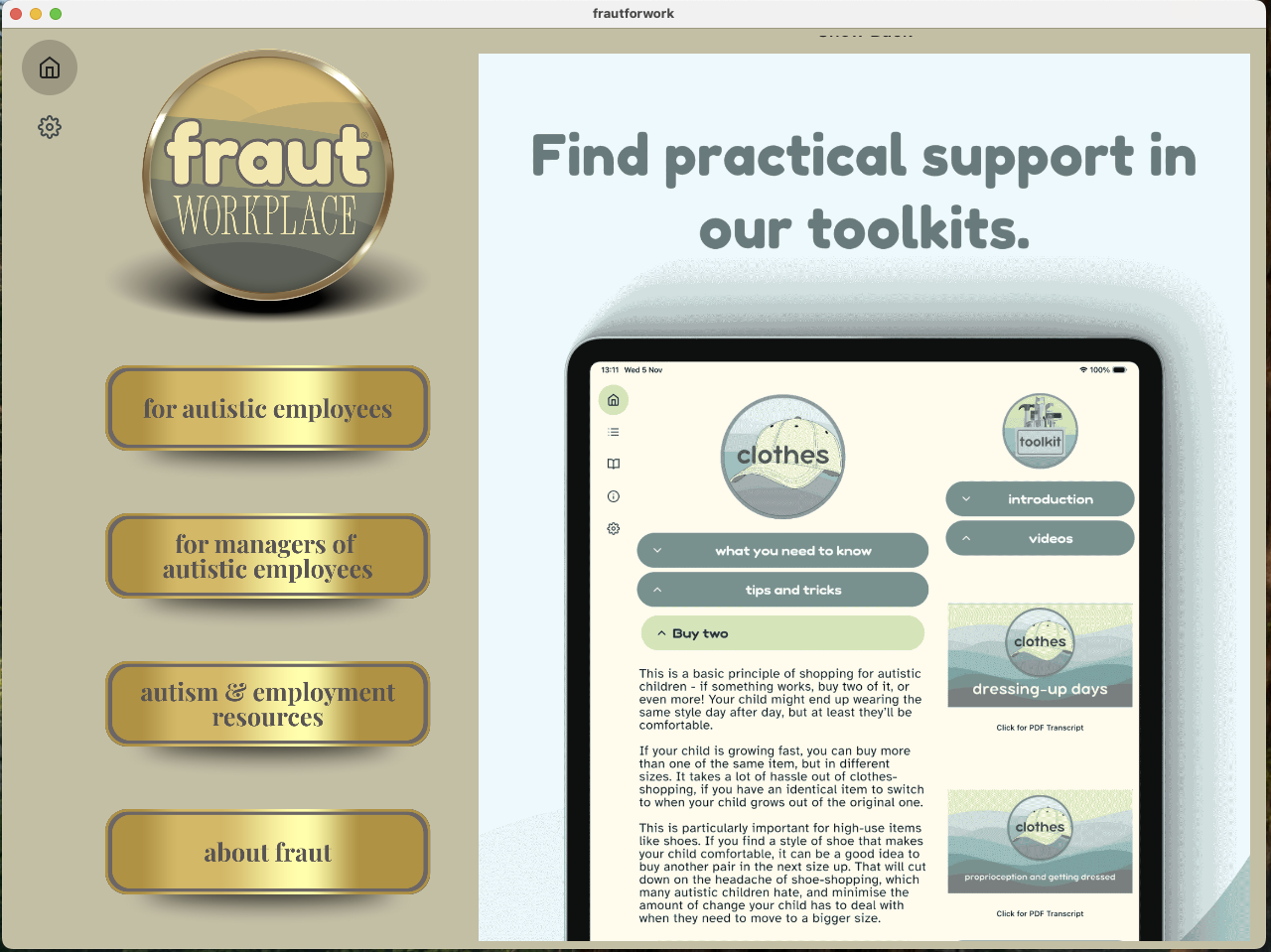 fraut:workplace is an app created by autistic people, for autistic people. If you’re autistic and in work, fraut provides you with practical tools, straightforward advice and empowering resources to help you navigate everyday workplace challenges with confidence.